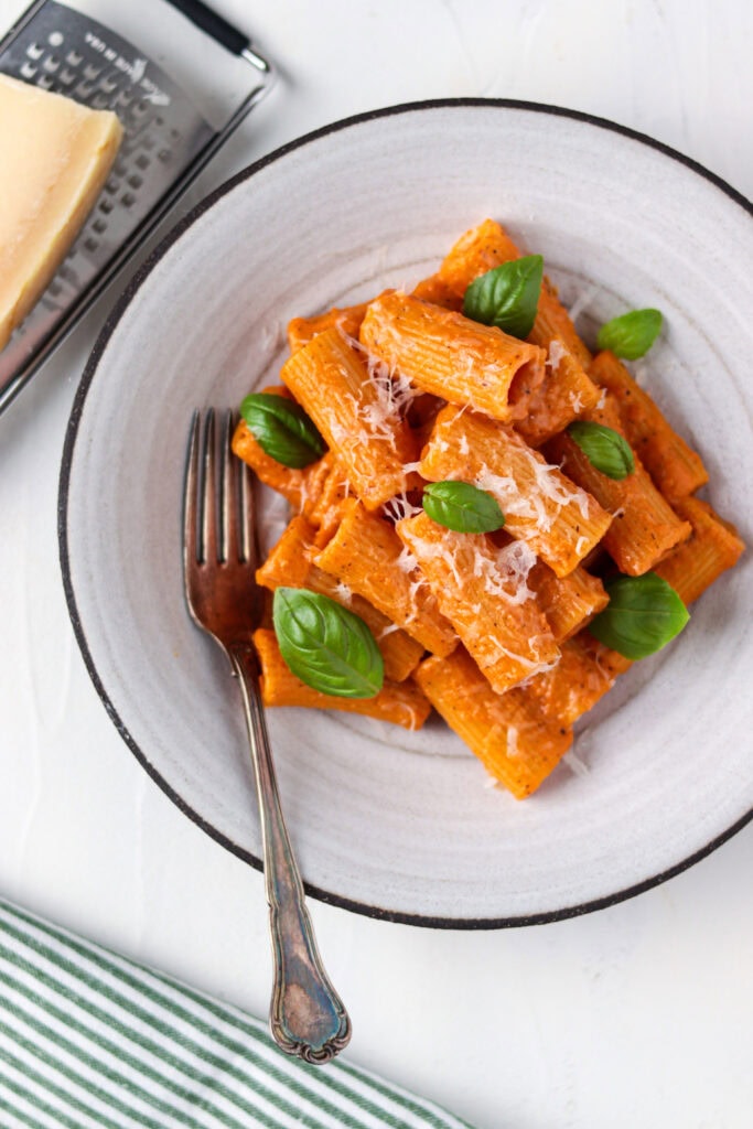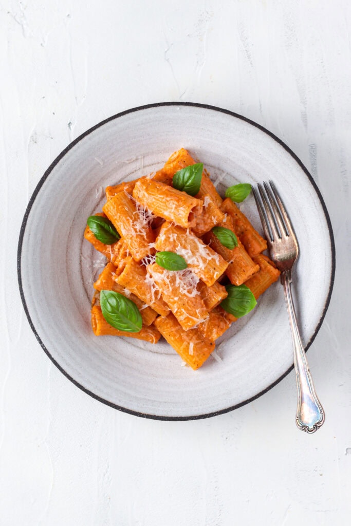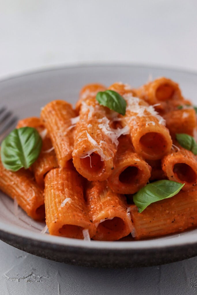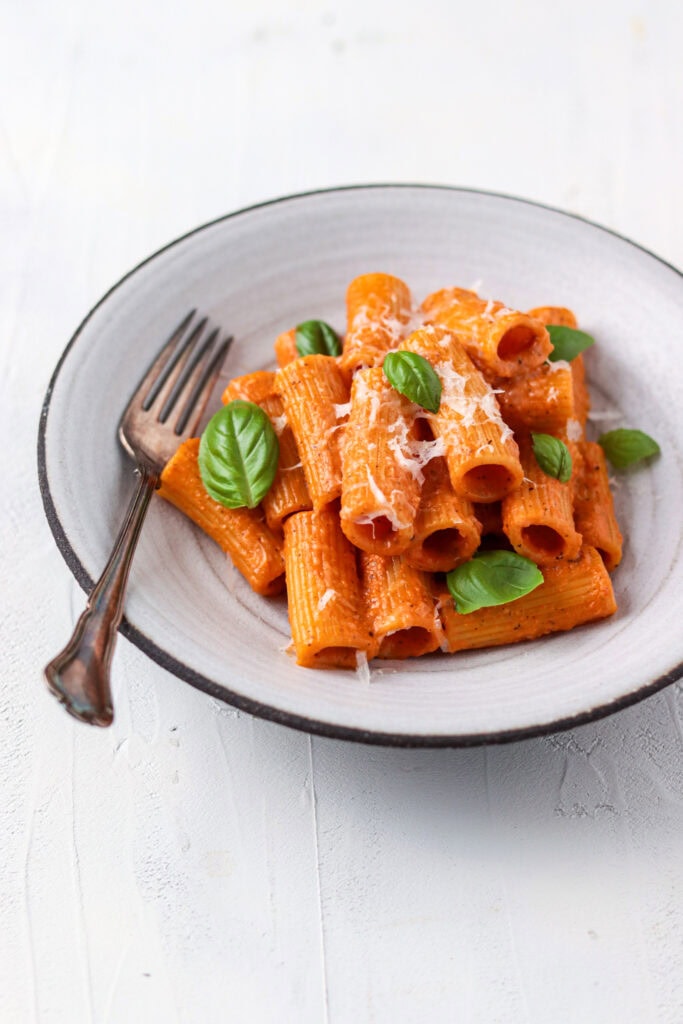 En klassisk vodka-pasta laves ofte med penne, og der er en god grund til det. De små rør fanger saucen indeni, så hvert eneste bid har det hele med. Rigatoni fungerer lige så godt, hvis du foretrækker lidt større pasta. Jeg har også lavet den med fusilli, og det holder saucen fint — egentlig fungerer enhver kort pasta med lidt tekstur bedre end lange, glatte typer her.